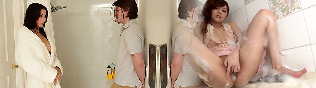 Japanese Slut Gets Blowjob from Two Guys While Stripping in Blue Bathroom