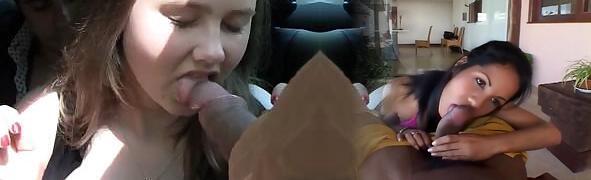 On Their Knees, Hot Brunettes Suck Dick And Cum All Over Each Other