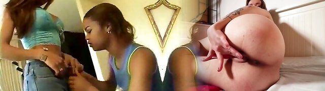 Fixing Her Tight Jeans: Shemale Interracial Threesome Blowjob Porn