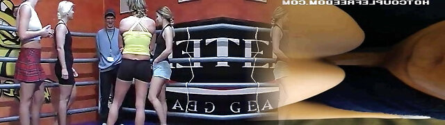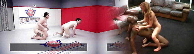 Topless babes wrestle fiercely in steamy ring action.