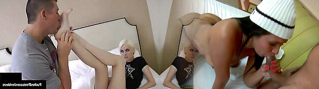 Busty Brunettes Blowing Banquet Cocks while Worshiping Feet - HD Foot Porn