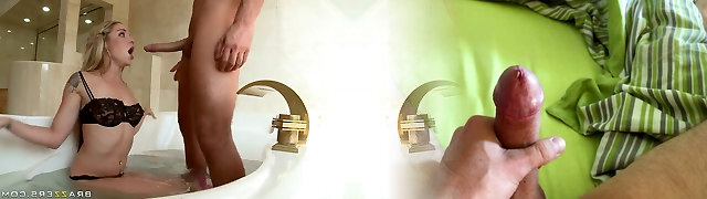 Petite blonde sucks huge cock POV