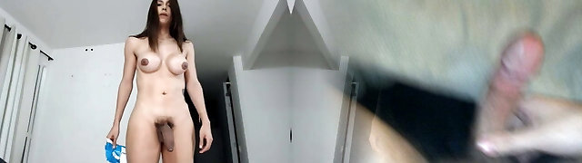 Busty Transsexual with Big Dick Stands Free while Preparing for Relaxation Time