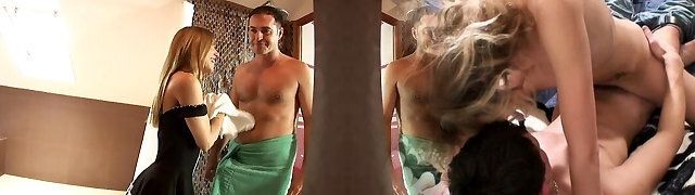 Busty Titties Get Fucked by Horny Street Whores in Gold Trimmed Room