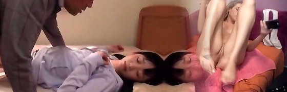 Hardcore Asian Threesome With Shaved Pussies and Big Dicks