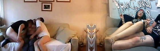 Zebra Print Slut Gets Fucked by Cock-Hungry Couple in Living Room Gangbang!