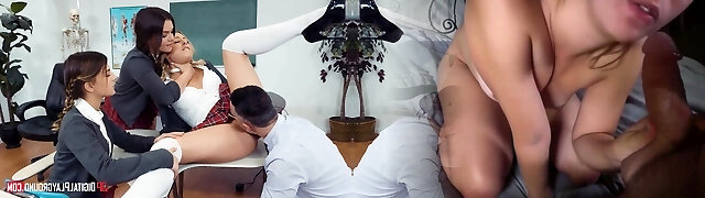 Teacher's Threesome Blowjob Sex With Big Tits Students In Class Room